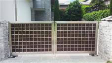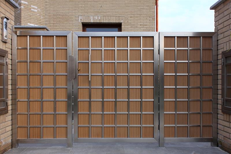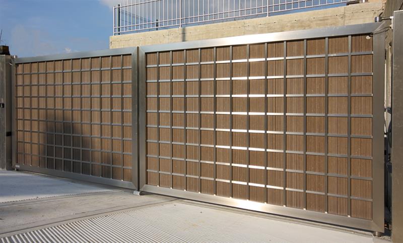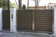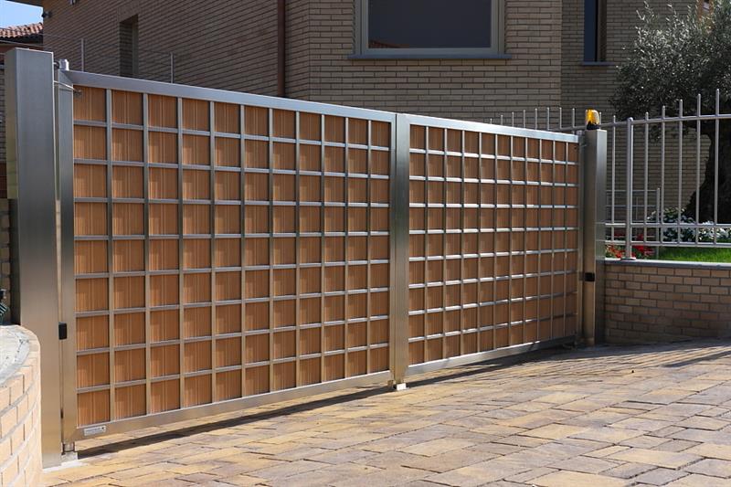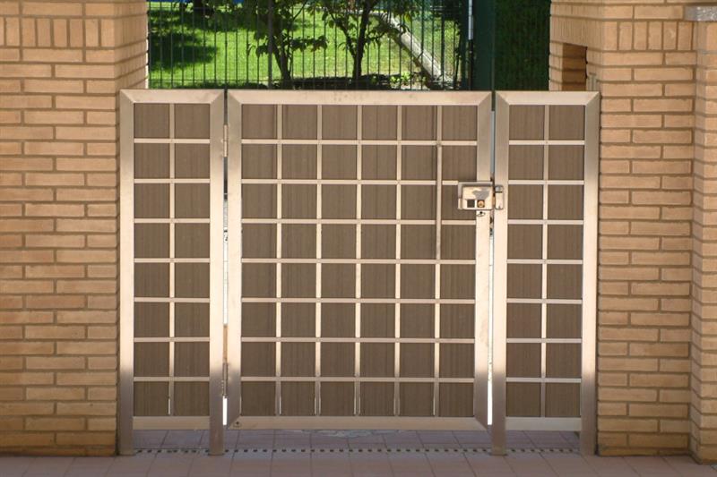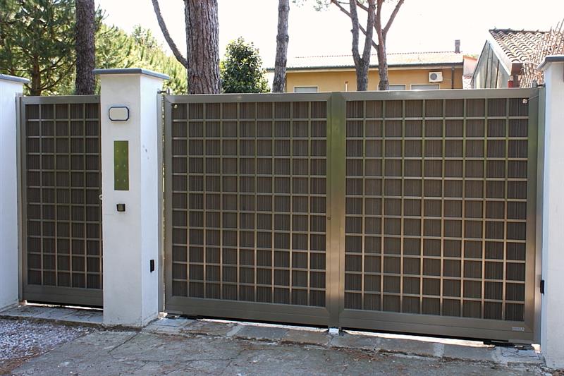 Cancello ad anta battente o scorrevole in tubolari d'acciaio inossidabile a sezione quadrata e rettangolare con finitura satinata .