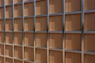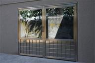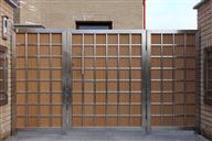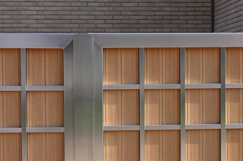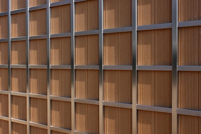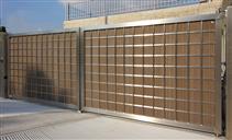 Telaio perimetrale in tubolare 80x80.Tamponatura con tubolari 40x20 e 20x10 incrociati mediante lavorazione con taglio laser con inserite doghe in alluminio anodizzato esente da manutenzione.