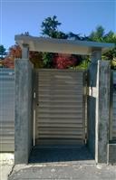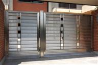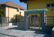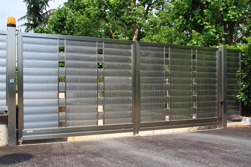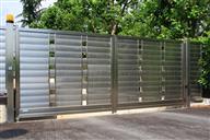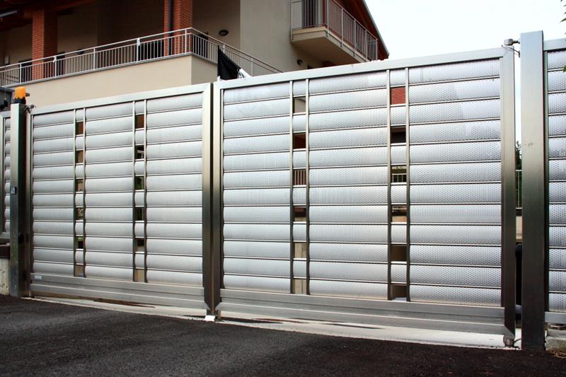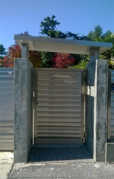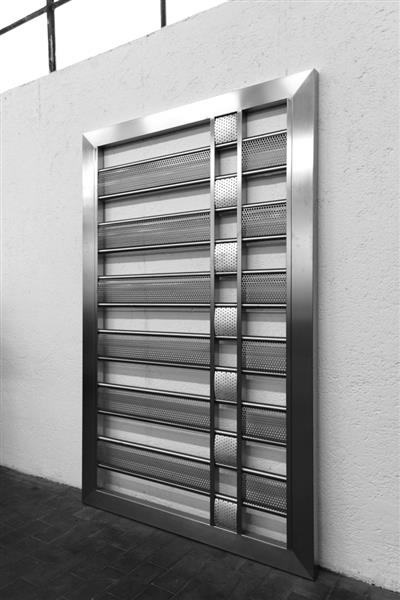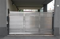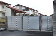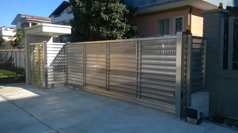 Telaio perimetrale in tubolare 60x60 o 80x80. Tamponatura con tubolari verticali 40x20 e orizzontali diametro 25 con inserite doghe in acciaio inox microforate .