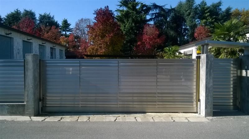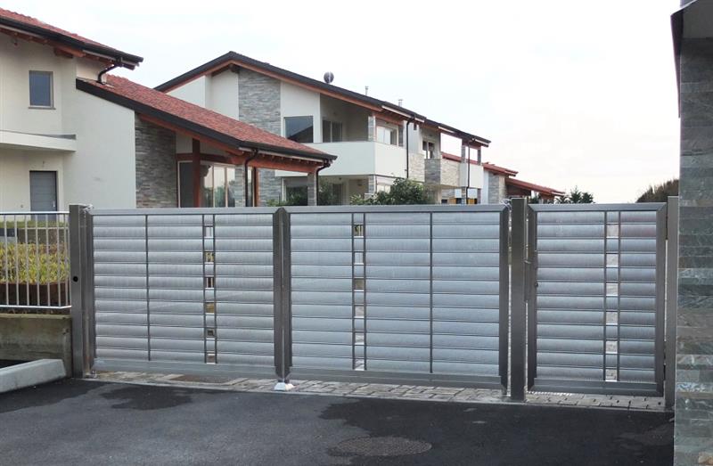 Cancello ad anta battente e scorrevole in tubolari d’acciaio inox a sezione quadra e tonda con finitura satinata