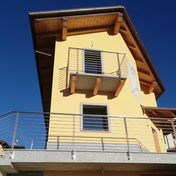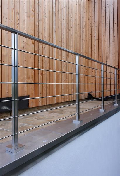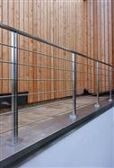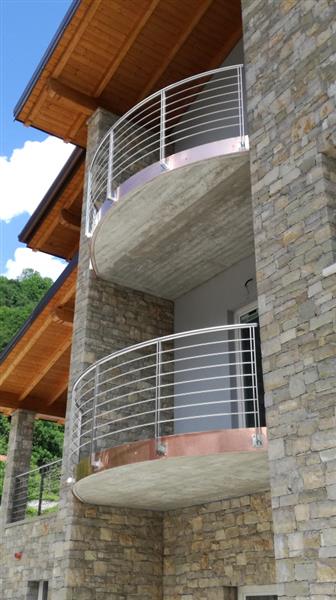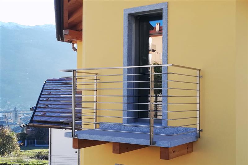 Il fissaggio può essere a muro, sul frontale soletta o sopra soletta, con zanche a murare o con flangia tasselli e viti. Disponibile anche un copriflangia di finitura. Altezza da pavimento: 100/110 cm.La tamponatura tra le piantane puo' essere realizzata con vetro stratificato temperato sostenuto con pinze in acciaio inox o mediante elementi orizzontali in tondo .