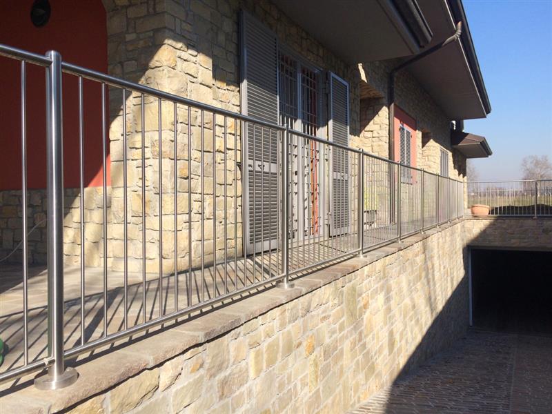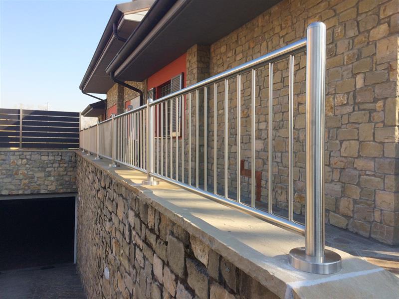 Tutti i particolari: tappi, staffe, bulloneria, sono in acciaio inox. Disponibile in Acciaio Inox AISI 304 .Il parapetto è certificato per una carico di 200 Kg/mt.